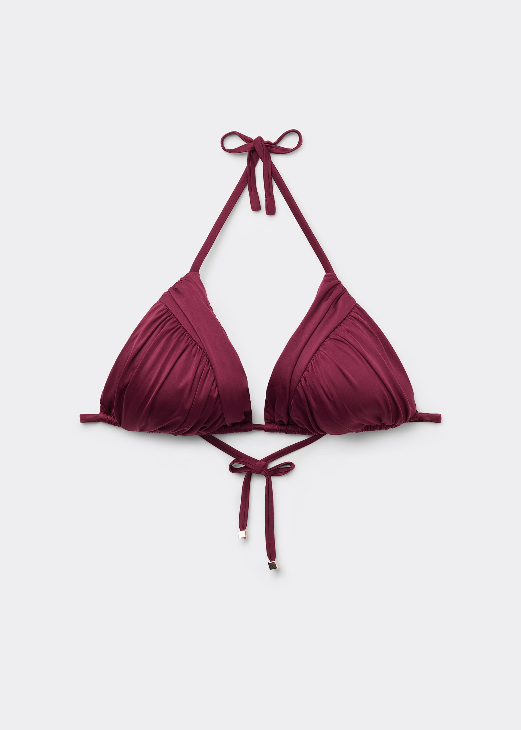 Wireless slide triangle bikini top with cups with removable padding. The style features bright fabric and ruching on the cups. The shoulder straps have eyelets on the ends so they can be hooked onto the back band or tied behind the neck. Back string tie closure.