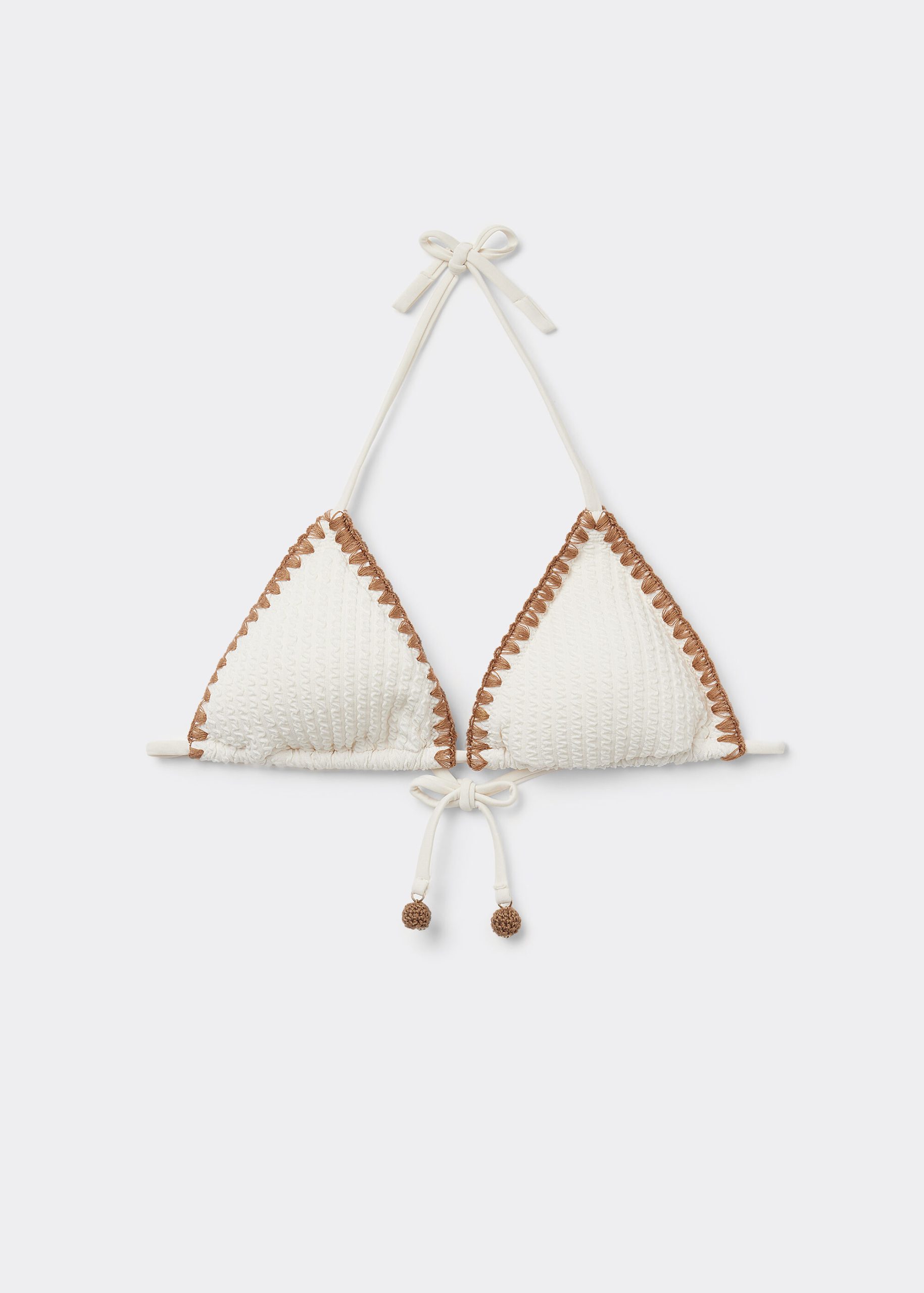 Slide triangle bikini top with removable cups and no underwire for a natural effect. The style features a crinkle fabric embellished with contrast color embroidery. The shoulder straps have eyelets on the ends so they can be hooked onto the back band or tied behind the neck. String tie closure in back.
