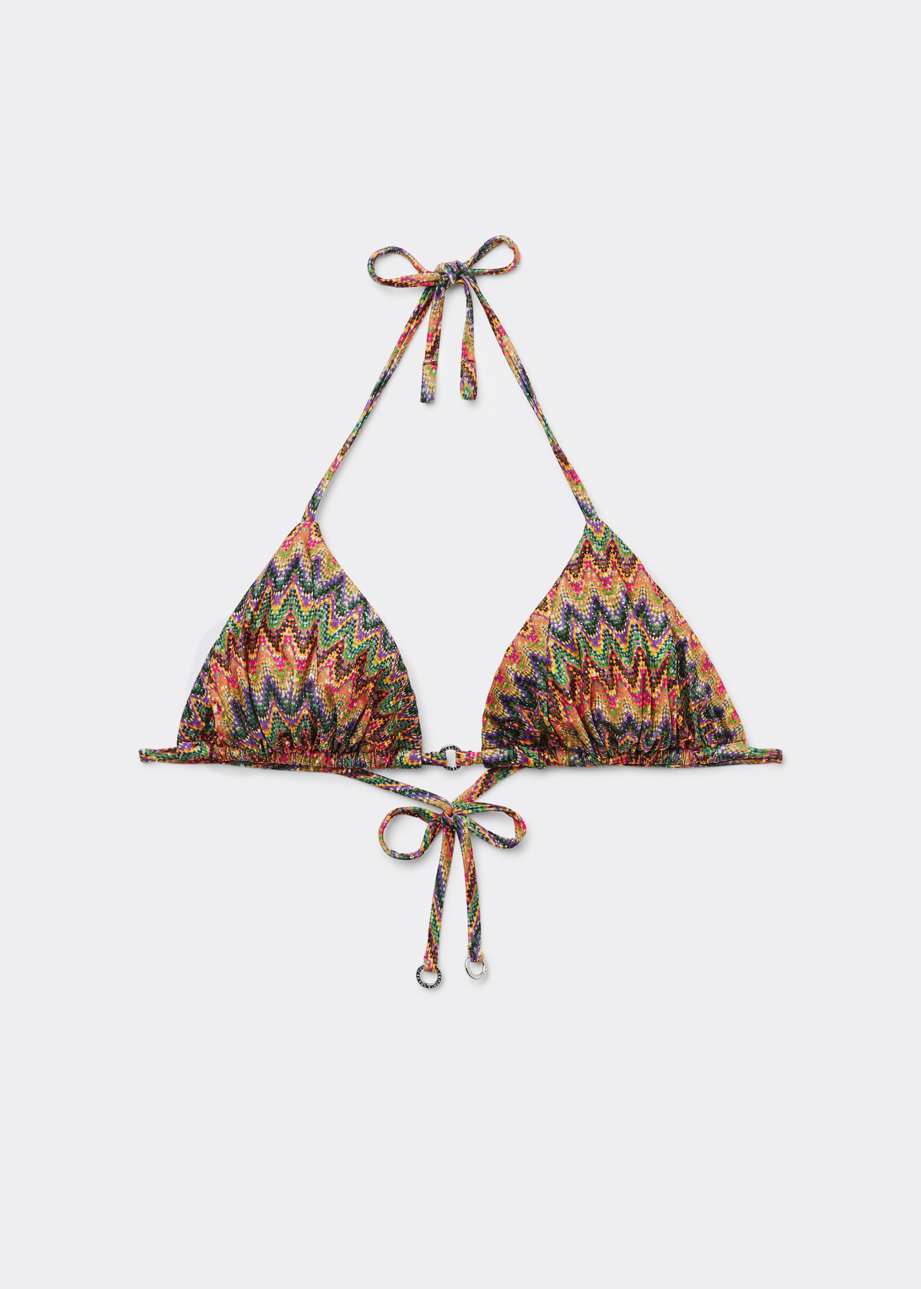 Slide triangle bikini top with removable padding, wireless for a natural effect. The multicolored pattern, featuring a wave motif and a bold mix of bright colors, has a dynamic effect ideal for the summer. The shoulder straps have eyelets on the ends so they can be hooked onto the back band or tied behind the neck. Back string tie closure.