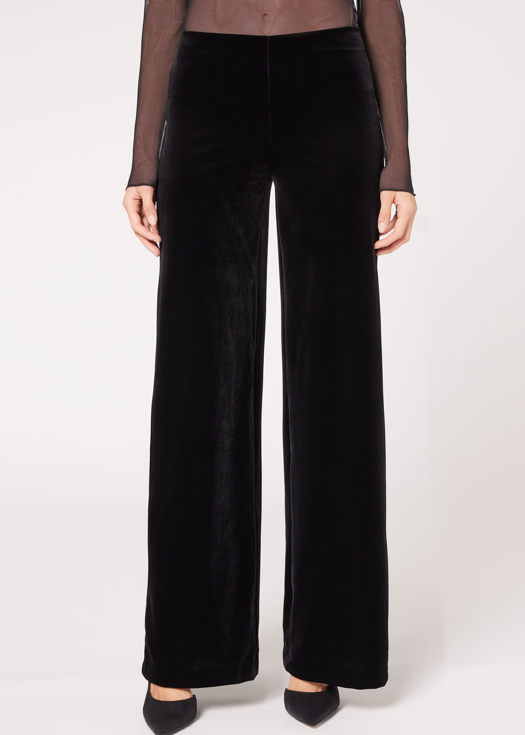 Women’s velvet palazzo pants, a perfect balance between comfort and style. This palazzo pant design features an especially soft and elegant fabric while the waistband with elastic only in the back ensures a comfortable and refined fit.